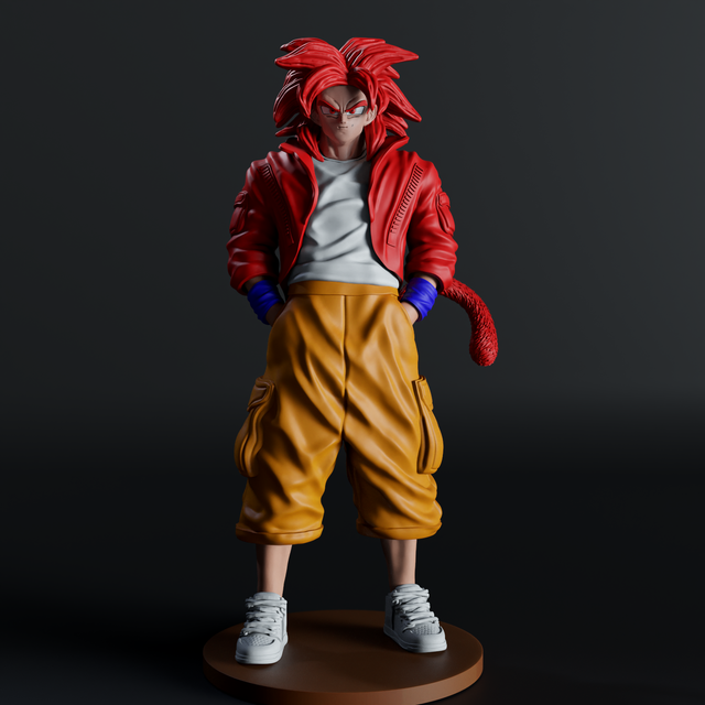A forma mais selvagem de Goku ganha nova roupagem: casaco vermelho, camisa branca, calças mostarda e ténis brancos.