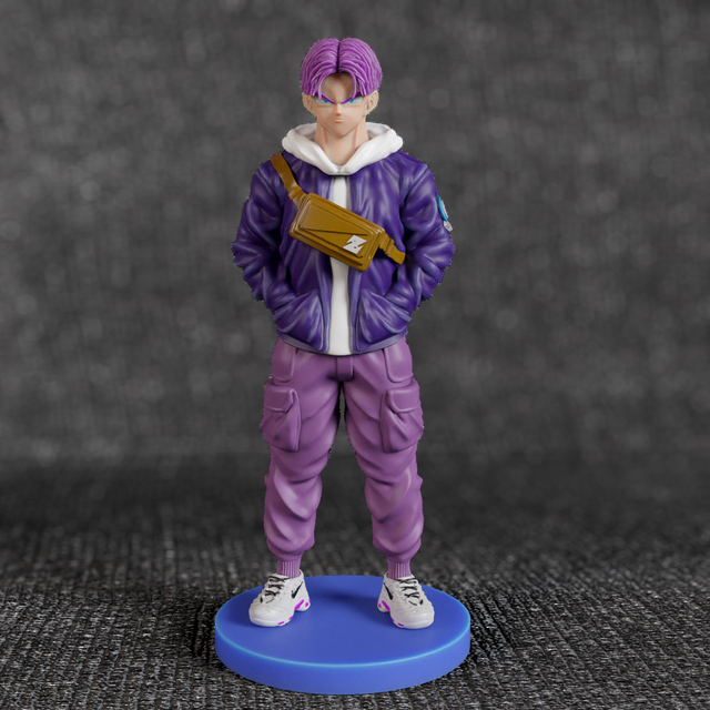 Trunks aparece com cabelo lilás e visual streetwear: hoodie branco, casaco roxo, calças cargo e ténis a condizer. A bolsa a tiracolo carrega mais do que objetos — carrega história.